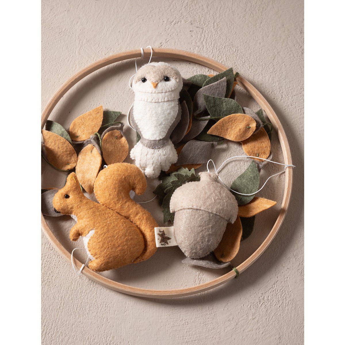 Sanfte Waldträume für Dein Baby: SAGA schwebt über dem Bettchen mit liebevoll handgefertigten Filzfiguren – ein neugieriges Eichhörnchen, eine weise Eule und eine zarte Eichel, die an herbstlichen Blättern baumeln. Der natürliche Holzrahmen und die neutralen Erdtöne schaffen eine beruhigende, harmonische Atmosphäre, perfekt für moderne oder rustikale Kinderzimmer. Sanft wiegende Figuren stimulieren die visuelle Wahrnehmung und verwandeln jedes Einschlafritual in einen kleinen, magischen Ausflug in den Wald.